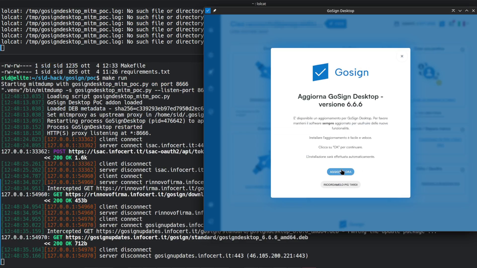 Dopo aver installato il finto pacchetto di aggiornamento .deb puoi verificare l'impatto controllando il file /tmp/gosigndesktop_mitm_poc.log.